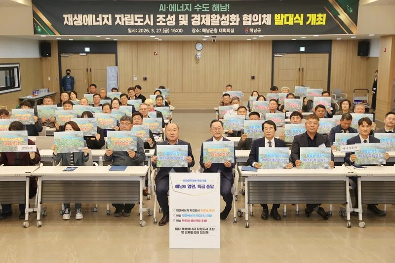 해남군은 27일 군청 대회의실에서‘해남 재생에너지 자립도시 조성 및 경제활성화 협의체’발대식을 개최하고, 재생에너지 중심 미래산업 기반 구축을 위한 민관 협력체를 공식 출범시켰다.