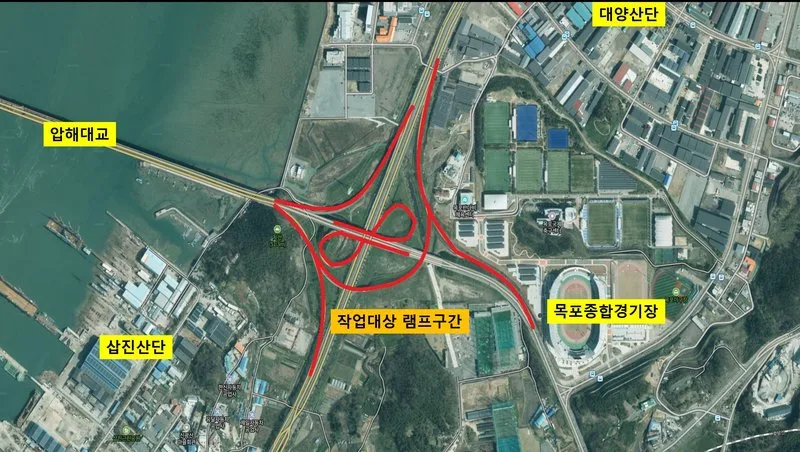 목포시는 오는 3월 31일부터 4월 1일까지 이틀간 압해대교와 자동차 전용도로가 만나는 램프 구간(교차로 접속도로)의 노후 가로등을 LED 조명으로 전면 교체하는 정비사업을 시행한다.