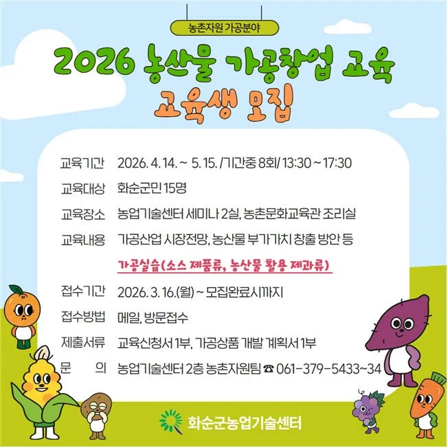 신청은 3월 16일부터 화순군농업기술센터 농촌자원팀을 통해 방문 또는 이메일로 접수할 수 있으며, 농산물 가공에 관심 있는 화순군민이면 누구나 신청이 가능하다.
