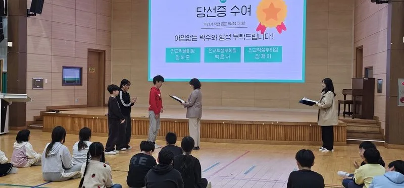서로의 생각을 존중하며 소통하는 과정 속에서 민주적인 의사결정 능력을 기르고, 따뜻하고 활기찬 학교문화를 만들어 가는 데 의미를 둔다. 2026년 처음 시작하는 자치회에서는 전교 회장과 부회장에게 당선증을 수여해 학생 대표로서의 책임을 다짐하는 시간을 가졌다.