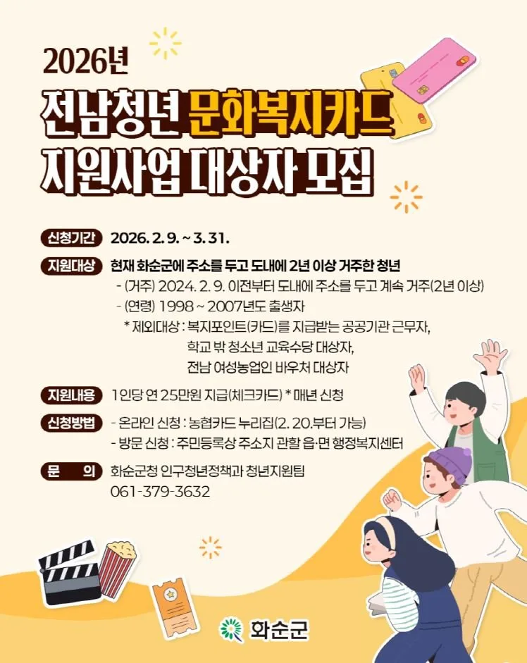 연 25만 원 지원 - 3월 31일까지 온오프라인 모집... 1998~2007년생 청년 대상 - 화순군(군수 구복규)은 지역 청년들의 자기 계발과 문화생활 기회를 확대하기 위해 ‘2026년 전남 청년 문화복지카드 지원사업’ 대상자를 오는 3월 31일까지 모집한다고 밝혔다.