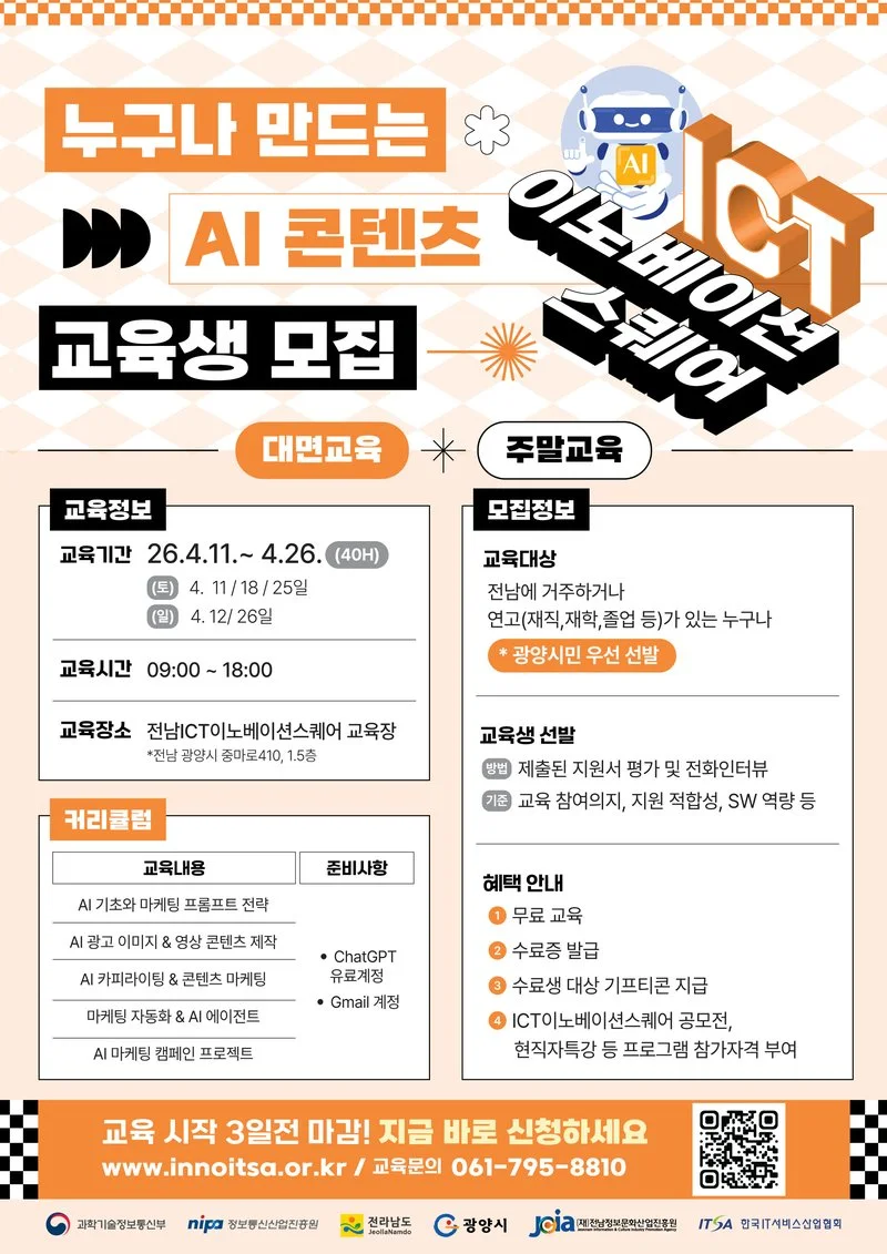교육 신청은 전남ICT이노베이션스퀘어 누리집(https://www.innoitsa.or.kr)에서 가능하며, 자세한 사항은 운영사무국으로 문의하면 된다.
