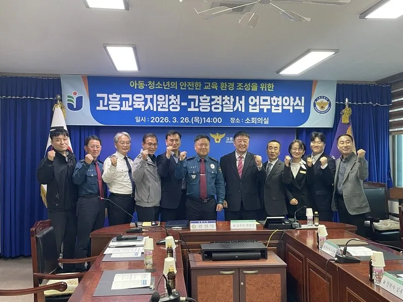 고흥교육지원청(교육장 권형선)과 고흥경찰서(경찰서장 안민탁)은 2026년 3월 26일 지역사회 내 학교폭력 근절과 아동·청소년의 안전한 교육환경 조성을 위해 업무협약(MOU)을 체결하였다.