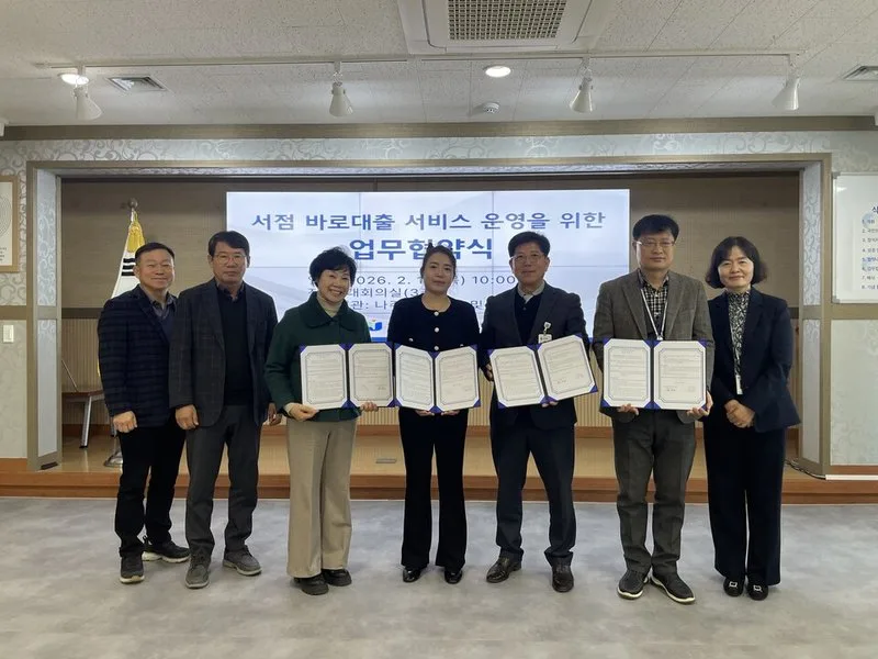 전라남도교육청나주도서관(관장 김의곤)은 2월 12일(목), 나주 혁신문고 및 한강문고와 ‘서점 바로대출 서비스’ 운영을 위한 업무 협약을 체결했다고 밝혔다. ‘서점 바로대출 서비스’는 도서관 이용자가 원하는 희망도서를 동네 서점에서 바로 대출하고, 반납까지 할 수 있도록 지원하는 생활밀착형 독서 지원 서비스다.