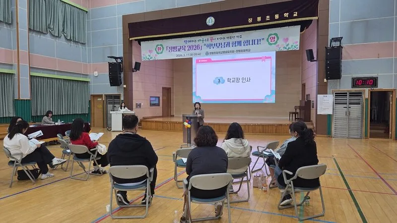 장평초등학교(교장 홍윤비)는 3월 17일 교내 체육관과 도서관에서 유치원을 포함한 전체 학부모를 대상으로 ‘2026학년도 1학기 학교교육과정 설명회 및 학부모총회’를 열고 학교 교육 방향과 주요 운영 계획을 공유했다.