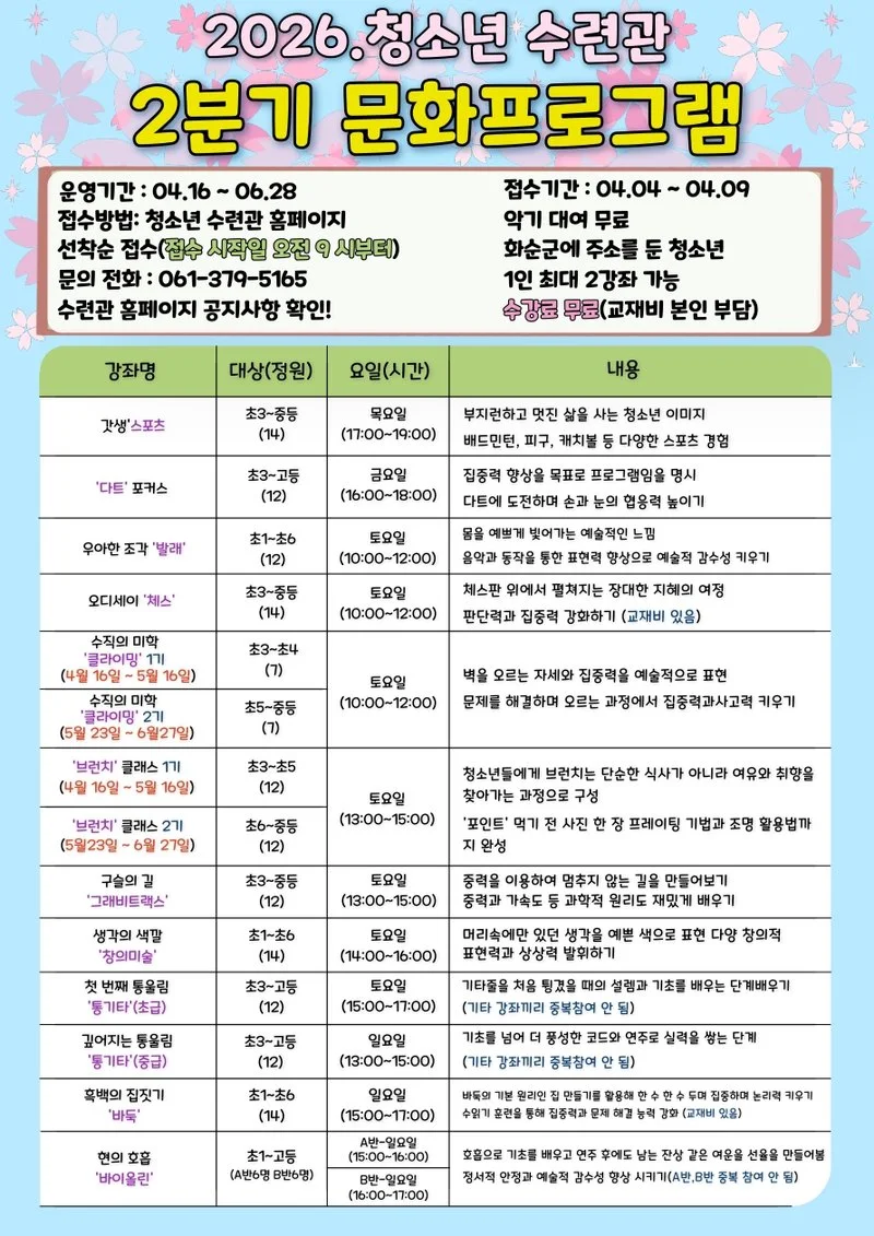 프로그램은 4월 16일부터 6월 28일까지 진행되며, 화순군에 주소를 둔 청소년이면 누구나 참여할 수 있다. 4월 4일부터 4월 9일까지 화순군청소년수련관 누리집 (https://hwasunyouth.kr/) ‘프로그램 신청 게시판’을 통해 온라인으로 신청 가능하다.