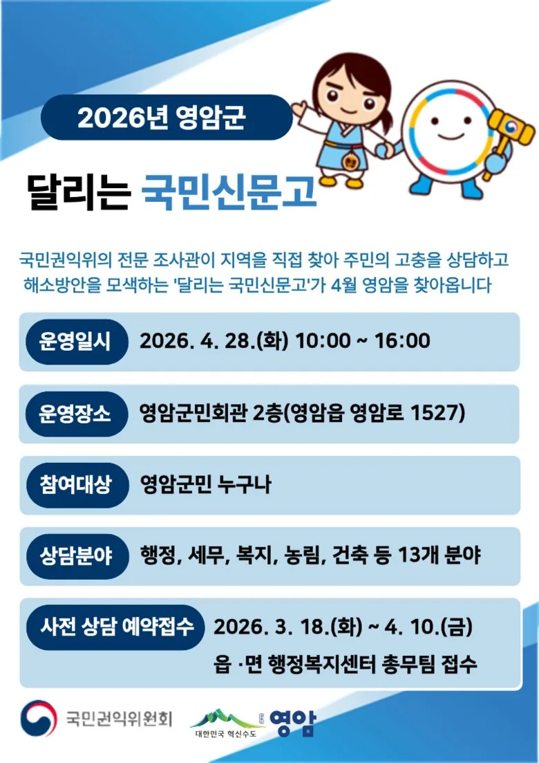 영암군은 국민권익위원회와 함께「달리는 국민신문고」를 운영해 군민 고충 해결에 나선다고 밝혔다.