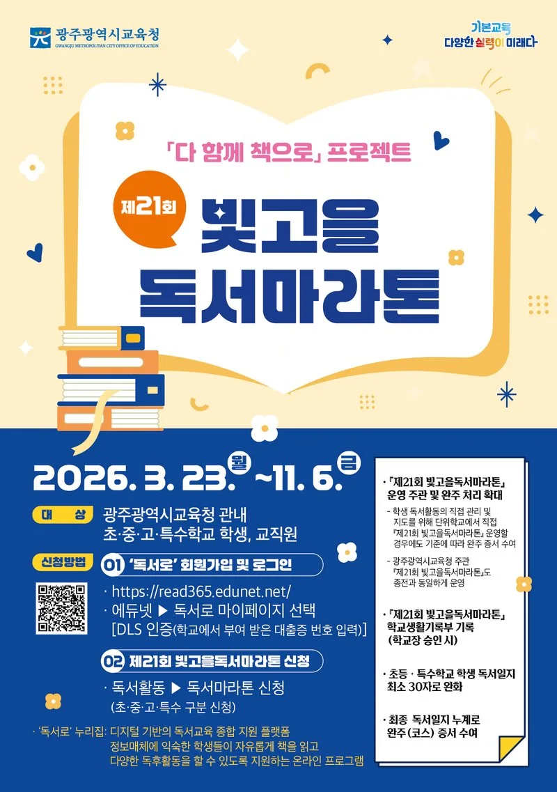 또한 학생들의 독서 이력 관리와 독서 상담 등을 위해 단위 학교에서 별도로 ‘제21회 빛고을독서마라톤’을 운영할 수 있다.