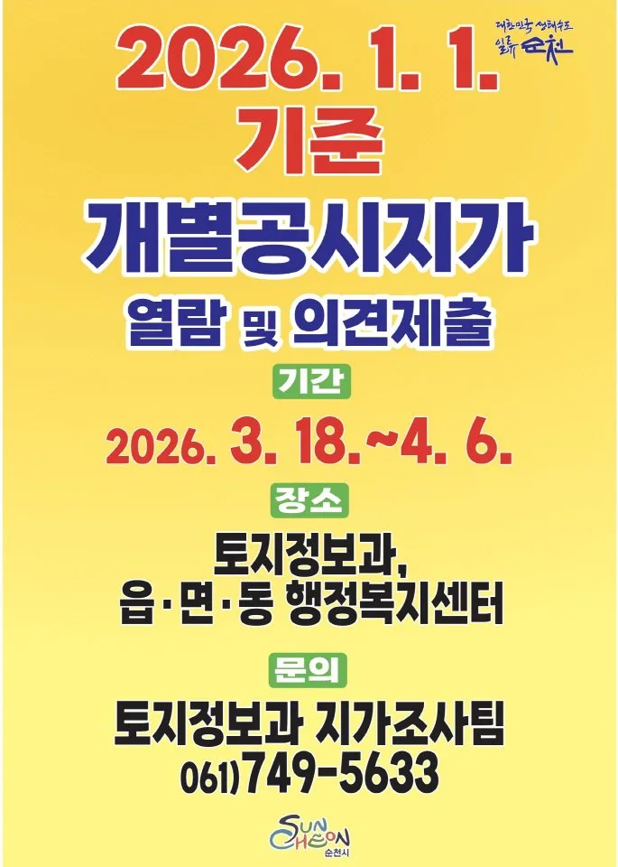 순천시는 2026년 1월 1일 기준 개별공시지가의 열람 및 의견제출을 3월 18일부터 4월 6일까지 접수한다고 밝혔다.