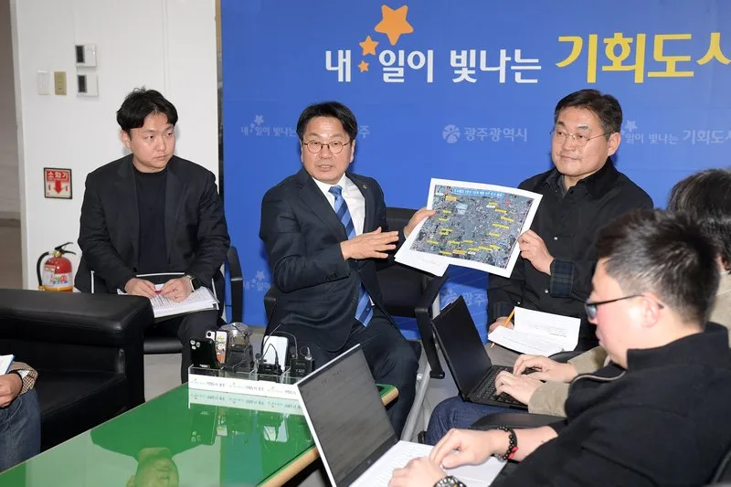 강기정 광주광역시장이 19일 시청 기자실에서 기자들을 만나 도시철도 2호선 1단계 18개 정거장의 역명 제정을 위한 시민 의견조사 결과 등에 대해 밝히고 있다. /광주광역시 제공 시민들의 높은 참여와 관심 속에 광주도시철도 2호선 1단계 역명 의견 수렴이 마무리됐다.