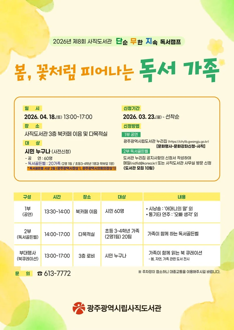 광주광역시 시립도서관은 사직도서관에서 가족이 함께 책을 읽고 지식을 나누는 ‘제8회 단무지(단순·무한·지속) 독서캠프’를 오는 4월18일 개최키로 하고, 캠프에 참가할 초등생 가족을 23일부터 선착순 모집하고 있다.