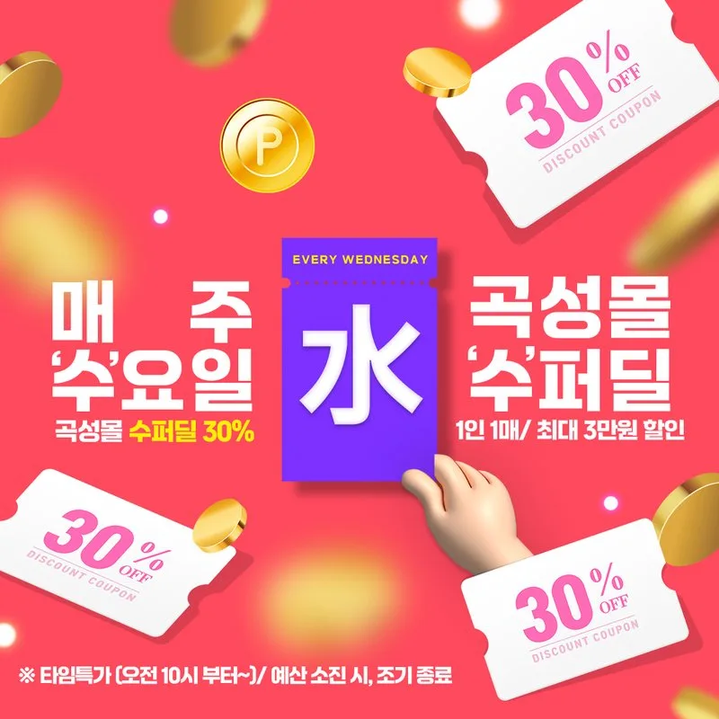 전남 곡성군은 군 공식 온라인 쇼핑몰 ‘곡성몰’에서 오는 3월 18일부터 ‘매주 수요일 30% 웬(즈)?!