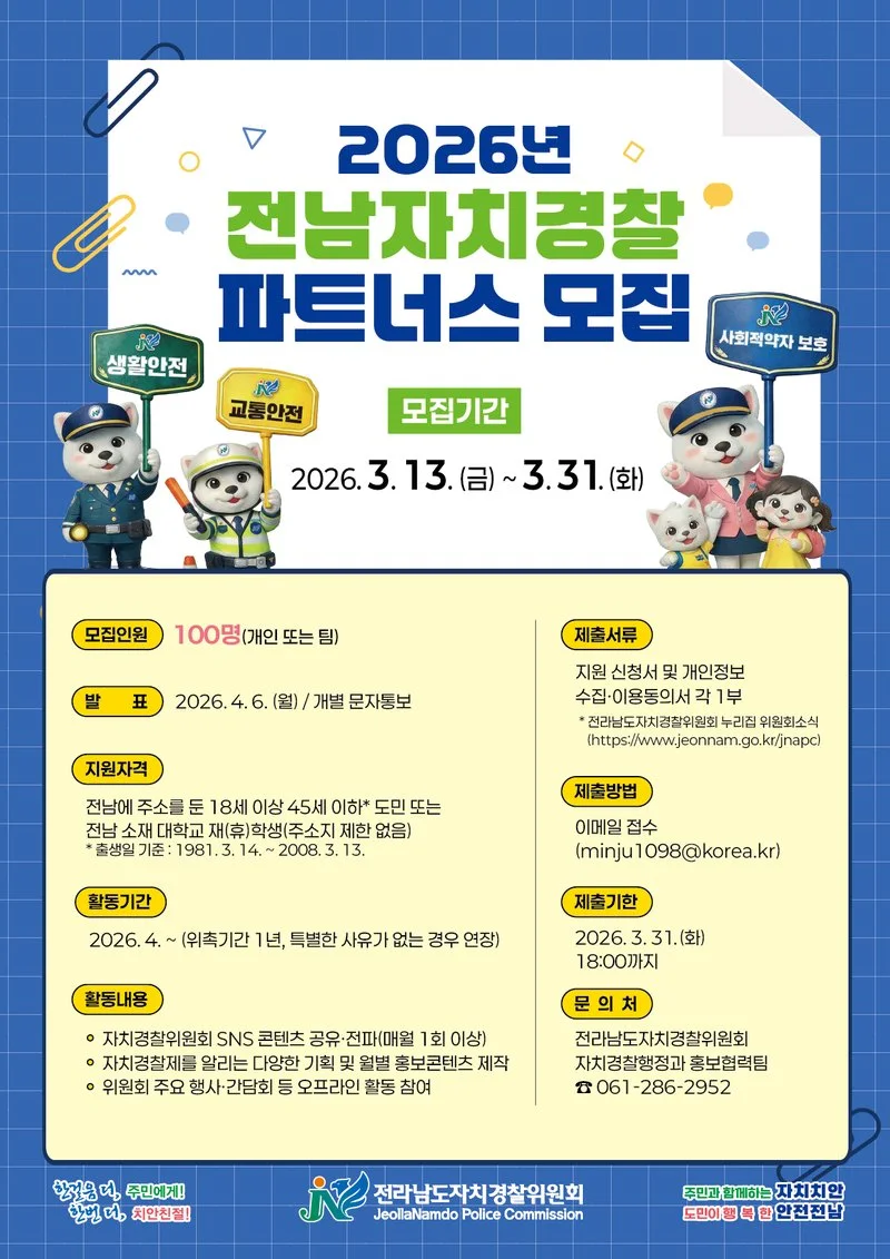- 4월 발대식·1년 활동…우수 활동자 표창 등 다양한 혜택 - 전라남도자치경찰위원회는 도민과의 소통을 강화하고 현장 중심 자치경찰 치안 활동을 함께할 ‘2026년 전남자치경찰 파트너스’를 31일까지 모집한다고 밝혔다.
